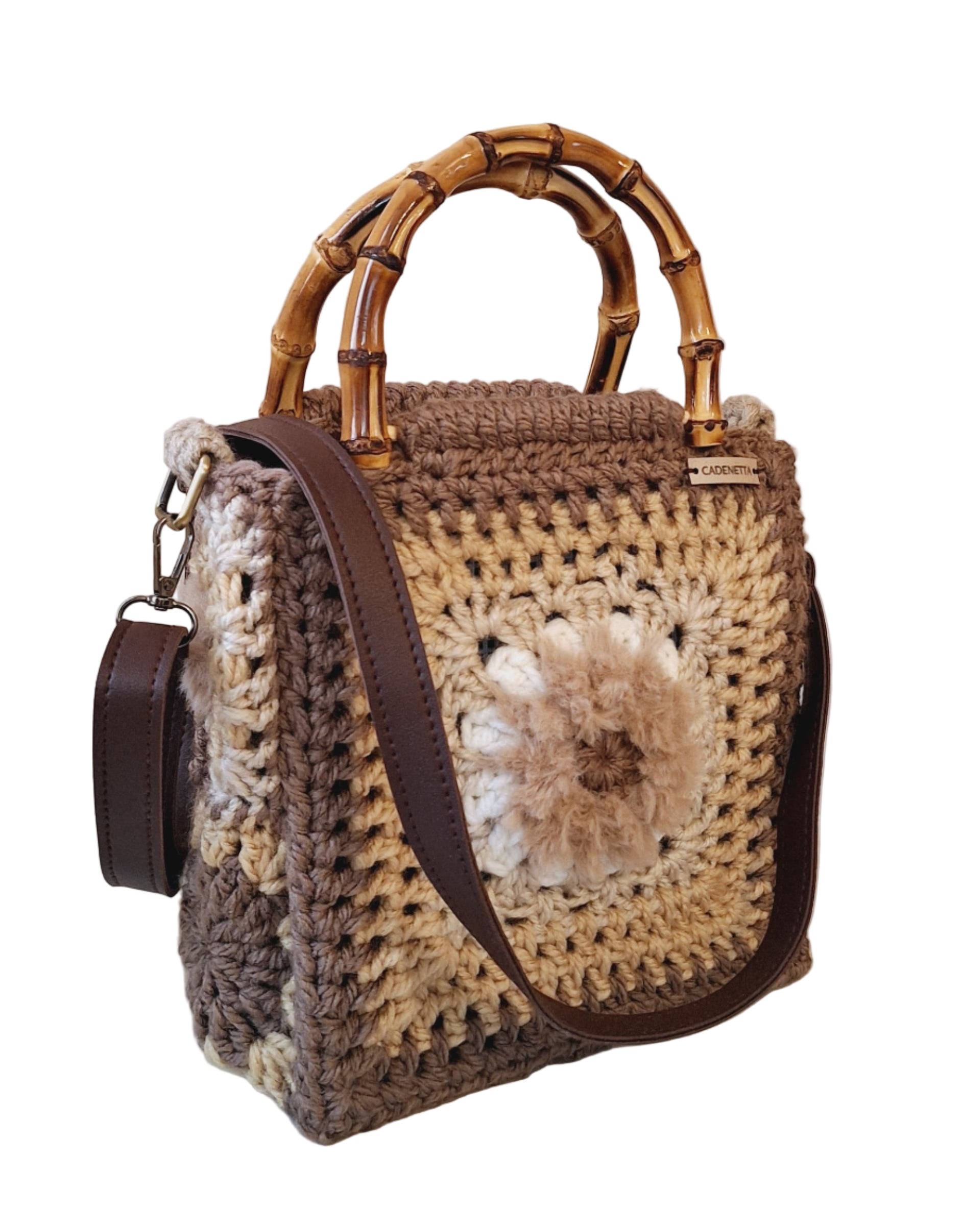 Nuestro bolso JULIA está tejido a mano con la técnica de granny square en tonos tierra que combinan con cualquier outfit. Su diseño compacto y estructurado lo convierte en el accesorio perfecto para el día a día, aportando un toque cálido y artesanal.